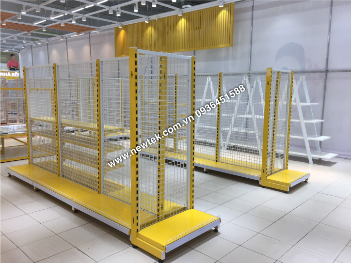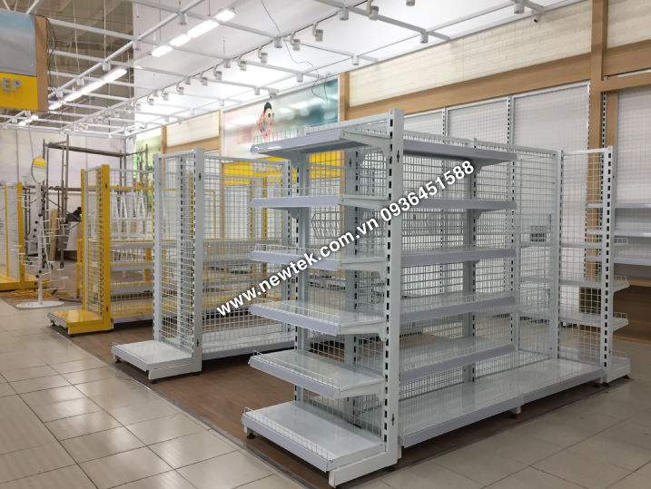 Mẫu kệ siêu thị mini phổ biến ở các siêu thị, lưng lưới đan ô 50×50 ; dễ dàng điều chỉnh tầng đợt, lắp ghép tháo rời.